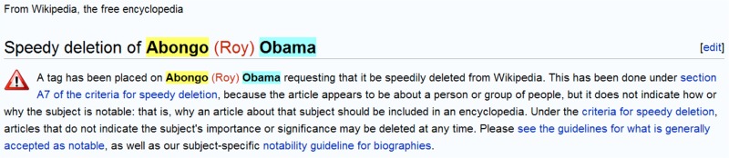 Lets begin with some interesting facts. Wikipedia, the great "neutral" source of knowledge has engaged in a deliberate cover-up operation about Abongo. They have put in place a blackout on some parts of human knowledge they feel is dangerous to their POV. Did you know Wikipedia had an article about Abongo Obama? It was immediately deleted! Look at this screenshot (click for full size)